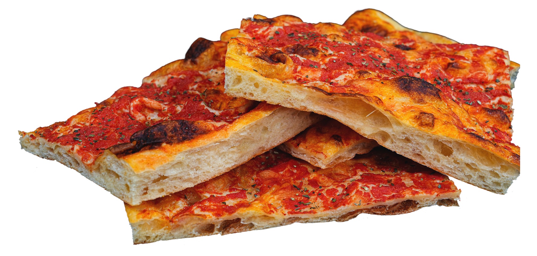 Roman-style "Pizza in Teglia" with rich Italian tomato sauce from Puglia region. Light, crispy. An authentic tray-baked pizza experience.