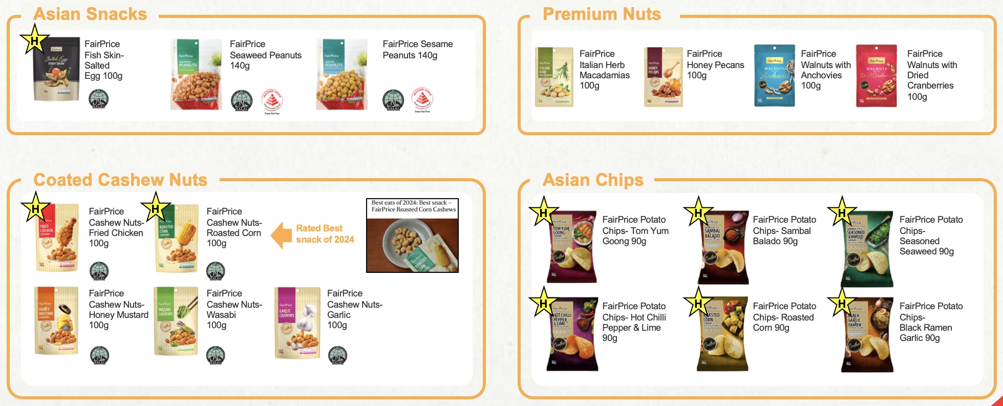 Snacks such as coated cashew nuts, asian flavoured chips, salted egg fish skin, premium nuts.